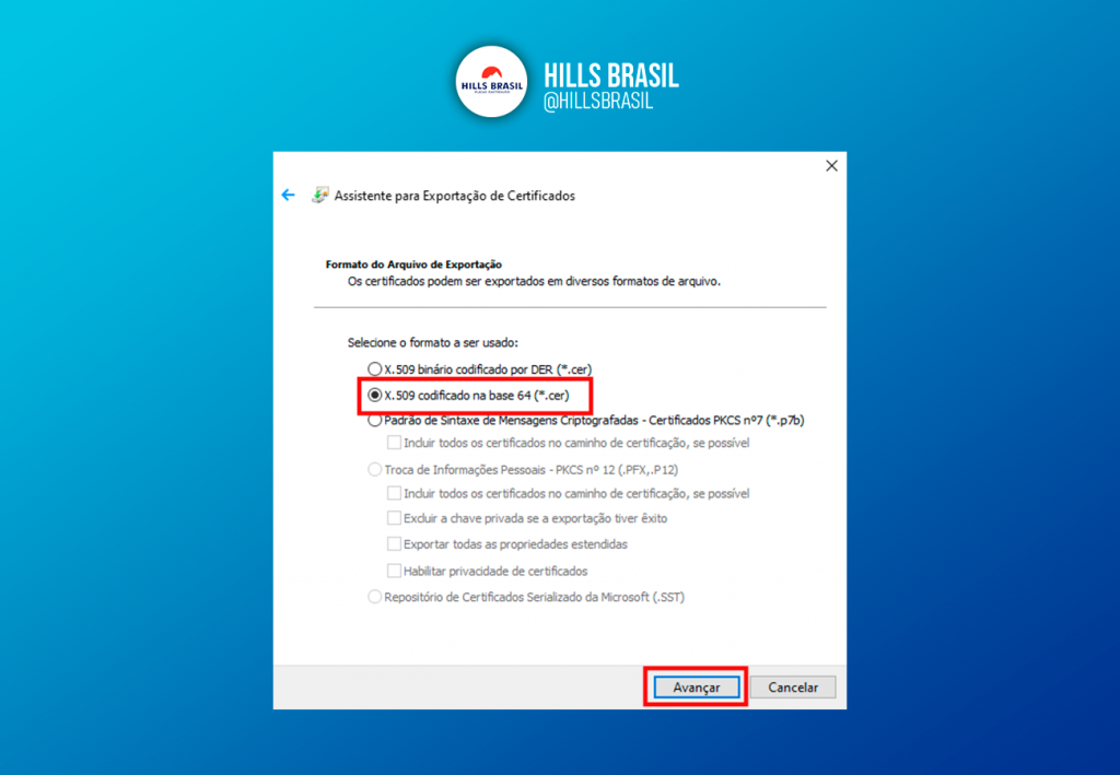 Escolha a opção “X.509 codficado na base 64(*.cer)” e clique novamente em avançar!