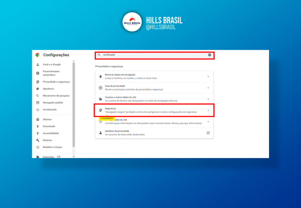 Na barra de pesquisa digite “Certificado” e clique em “Segurança“!