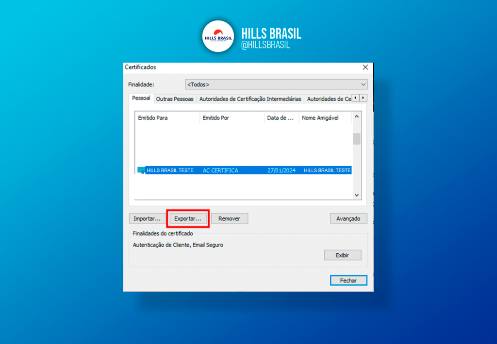Selecione o seu certificado digital já instalado na maquina e clique em “Exportar” assim como na imagem!